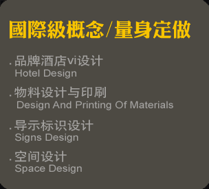 酒店品牌顧問、酒店品牌策劃、標志設計、品牌(CIS)設計,酒店廣告宣傳設計、標識牌制作、印刷等整合服務。