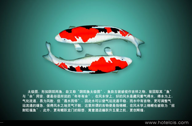 陰陽魚太極圖:酒店標志實的部分,形如陰陽兩魚,故又稱“陰陽魚太極圖”。魚自古就被視作吉祥之物,皆因取其“魚”與“余”同音,便是俗語所說的“年年有余”。在風水學上,好的風水是藏風蓄氣得水,得水為上。氣處流通,易為風散,但“遇水而停”。因此水可以使氣運流通平穩。而水中有吉物,更可調整氣運流通的緩急,保得風水之地靈氣不散。這里所謂的吉物便是指錦鯉,在風水學上錦鯉也被稱為“招財旺福魚”。此外,更有鯉躍龍門的聯想,寓意酒店籍躍升五星之機,更創輝煌。
