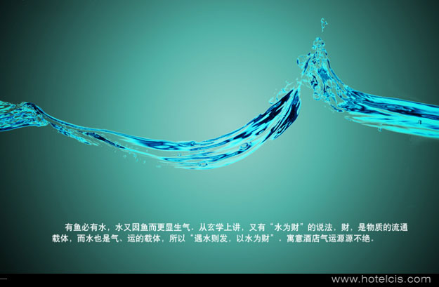 以水為財:有魚必有水,水又因魚而更顯生氣。從玄學上講,又有“水為財”的說法,財,是物質的流通載體,而水也是氣、運的載體,所以“遇水則發,以水為財”。寓意酒店氣運長存,財源滾滾。