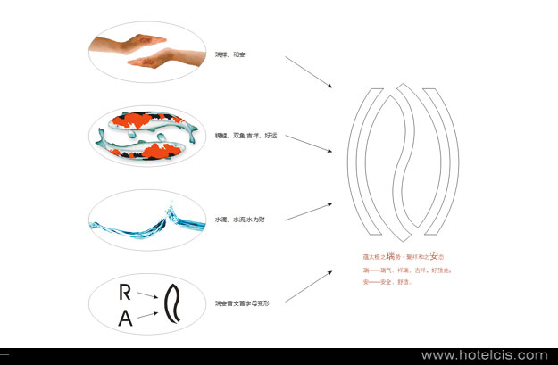 標志的主體設計元素RUIAN首字母,瑞安國際大酒店標志創意中虛的線條部分,代表酒店標志的第一個字母R,左右對稱,更喻含國際化的酒店理念。