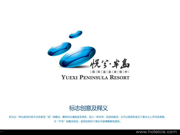 【人和時代·中國】專業溫泉酒店度假村VI設計公司,悅兮半島國際溫泉度假村標志以一種比較現代的手法來展現“泉”的概念。整體如水滴般晶瑩透亮,給人一種潔凈、閑適的感覺;又可以聯想到藍天下碧水之上浮島 的景象,與“半島”的概念相近。造型還取材于景區內玻璃橢圓型建筑。